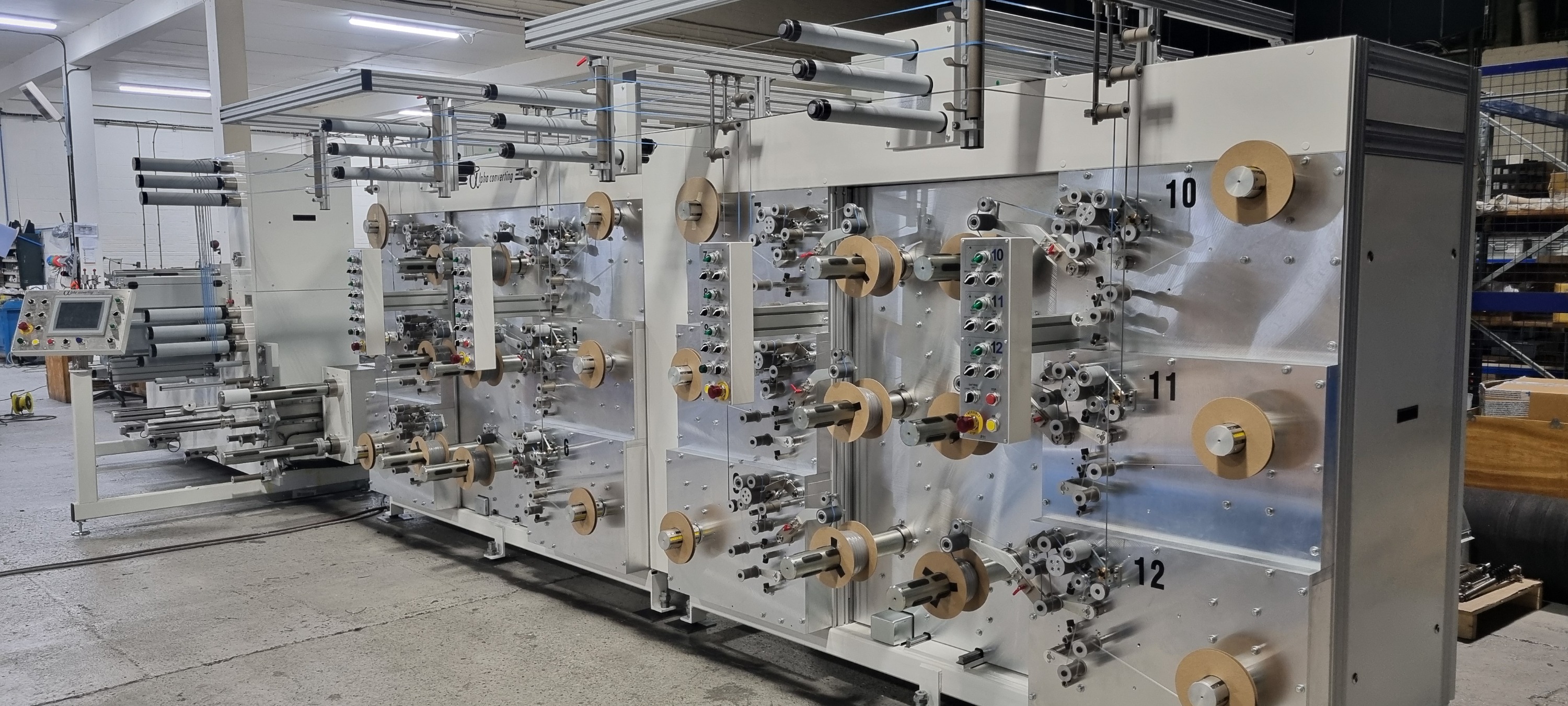 Spooler modulaire à 12 postes type ALPHASPOOL 6 configuré pour les rubans adhésifs et les mousses. Comprend un déroulement en porte-à-faux avec une boîte de refente interchangeable, plusieurs rouleaux de traction et un chemin d'enfilage simple.