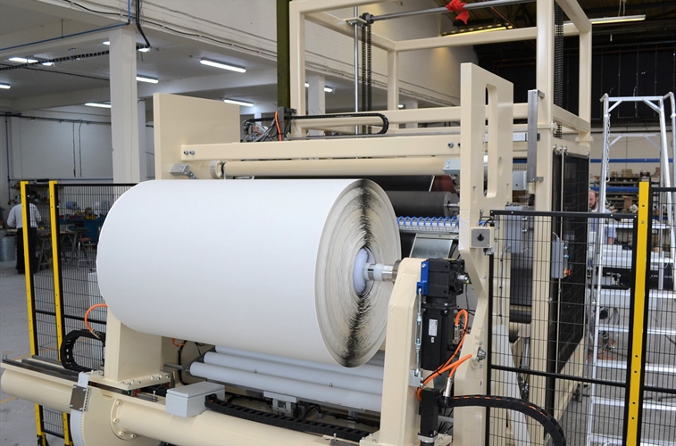 Automatischer Schmalwalzenwickler für Lebensmittelverpackungsfolien. Manuelles Laden und Entladen der Kerne.